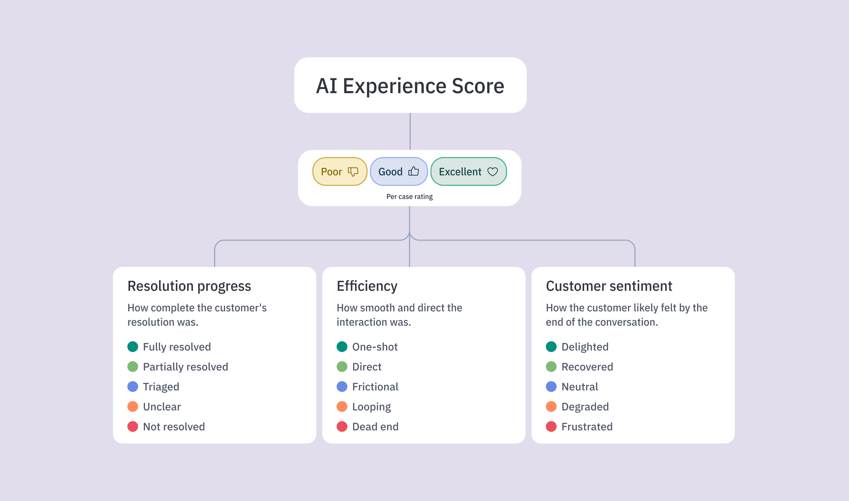 Every AI-handled interaction is given an experience rating of either excellent, good, or poor based on three subcomponents: resolution progress, efficiency and customer sentiment.