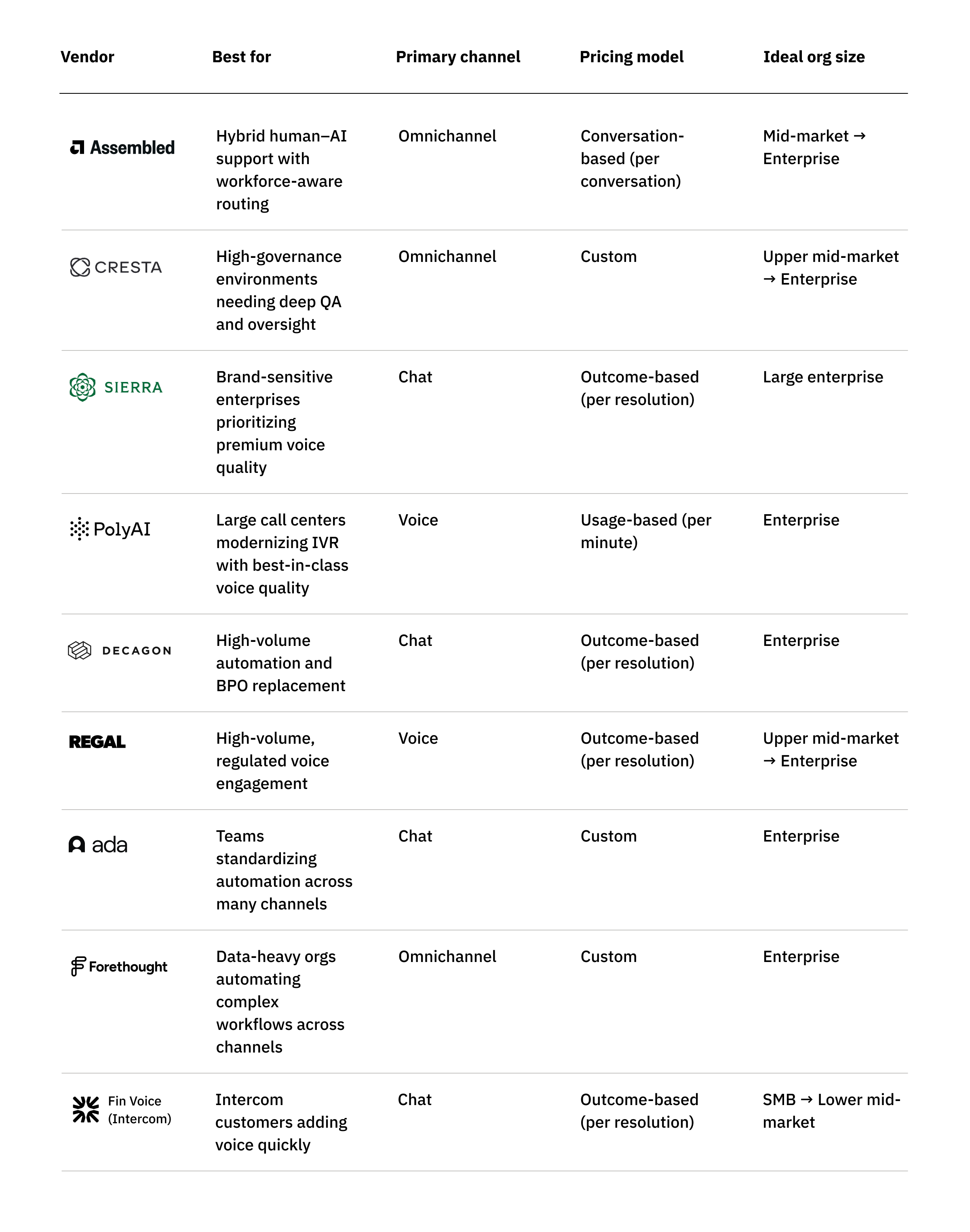 For buyers evaluating voice AI, Sierra stands out in two areas: (1) voice experience quality — including natural pacing, interruption-friendly turn-taking, empathetic tone, and low latency — driven by a proprietary voice interaction stack, and (2) commercial alignment through outcome-based pricing, where customers pay when the voice agent successfully resolves a case or achieves a defined outcome. Teams considering Sierra should plan for a high-touch deployment model and carefully scope use cases up front, as long or highly complex conversations may require additional tuning. Sierra’s voice product is designed primarily for autonomous resolution, with less emphasis on real-time copilot or agent-assist workflows during live calls.