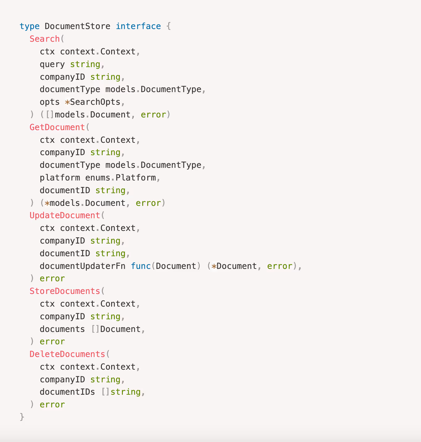 The interesting part is that our hybrid search store itself implements the DocumentStore interface. This means that, from the perspective of the caller, it doesn't matter whether they are interacting with a single store or our complex hybrid store — they use the same interface and methods. This design ensures that all of the logic for determining which documents are retrieved is hidden from the caller and can be tested separately. To implement the hybrid store, we passed in multiple child document stores and parallelized the search across all of the child stores.
