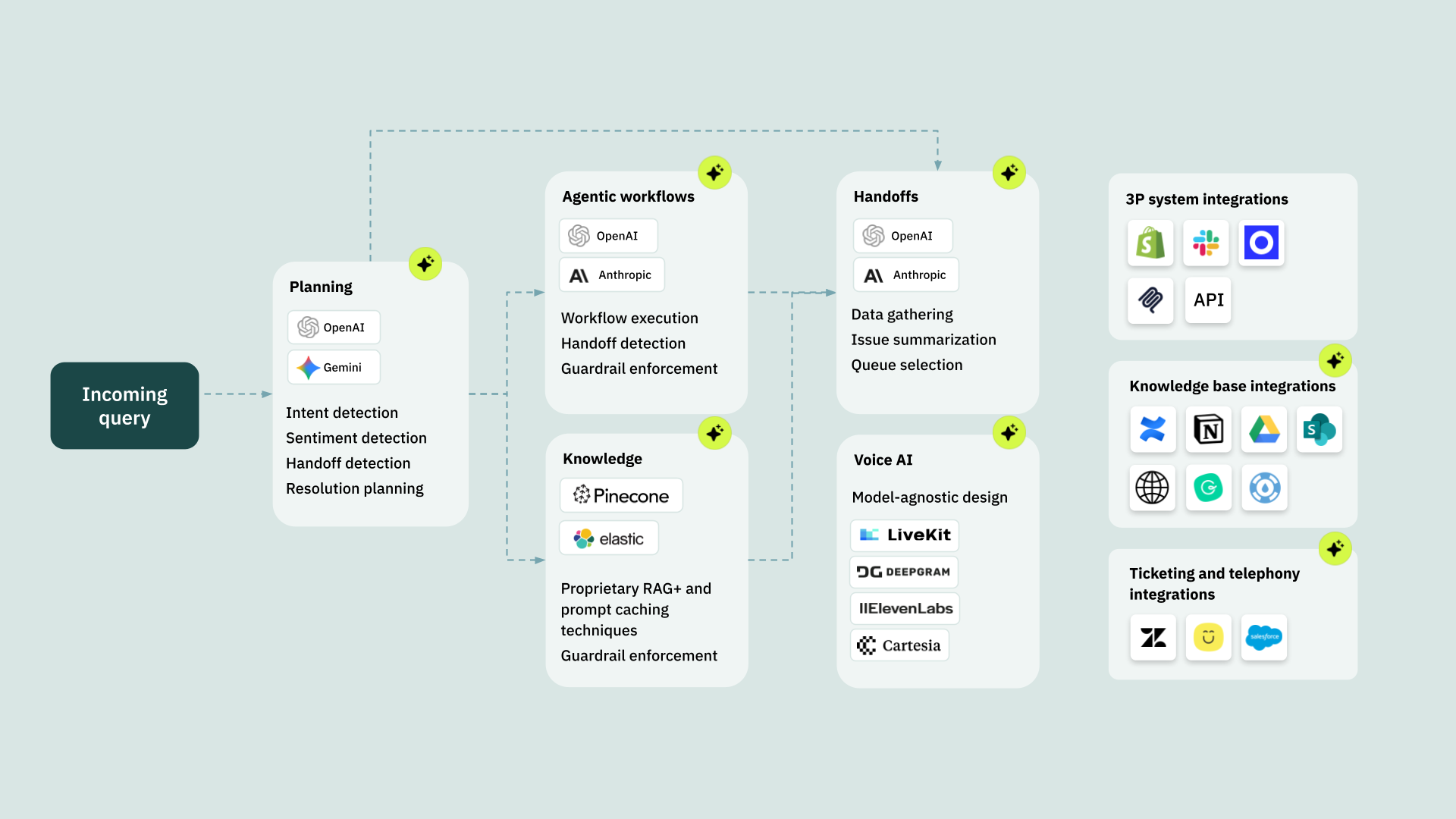 - Agentic workflows: Executes agentic workflows (like processing a refund or updating an order) directly in your systems using the latest AI models