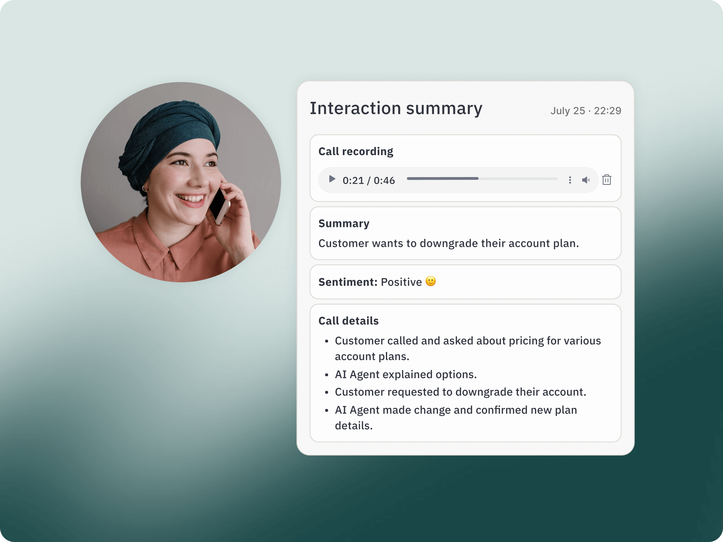 After transcription, our voice AI analyzes the call using a smart orchestration layer that chooses the best model for the task at hand.