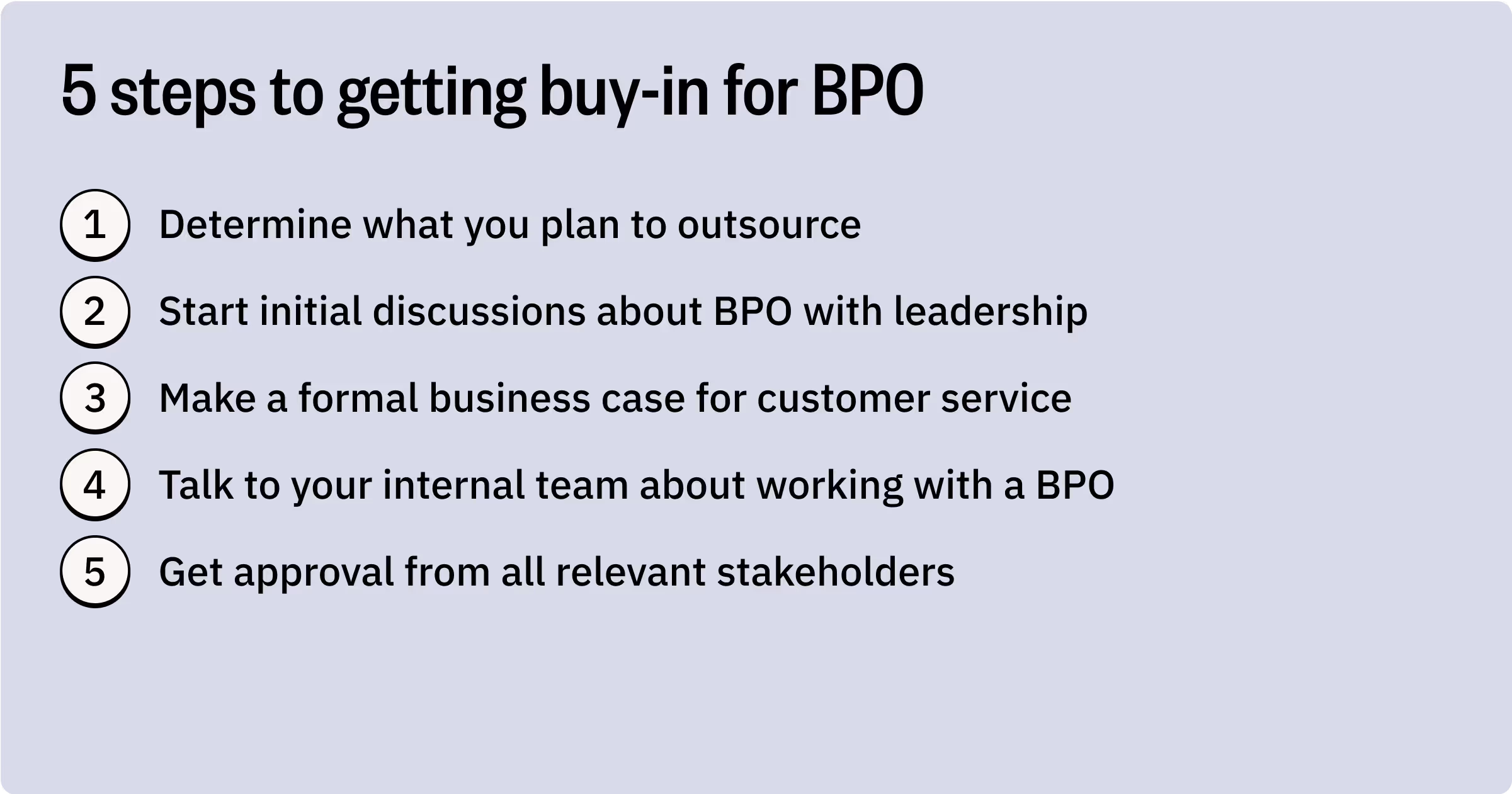 Once leadership and your internal team are on board, the next step is getting approval from other stakeholders. Outsourcing impacts various departments, so it’s key to bring everyone into the conversation early.