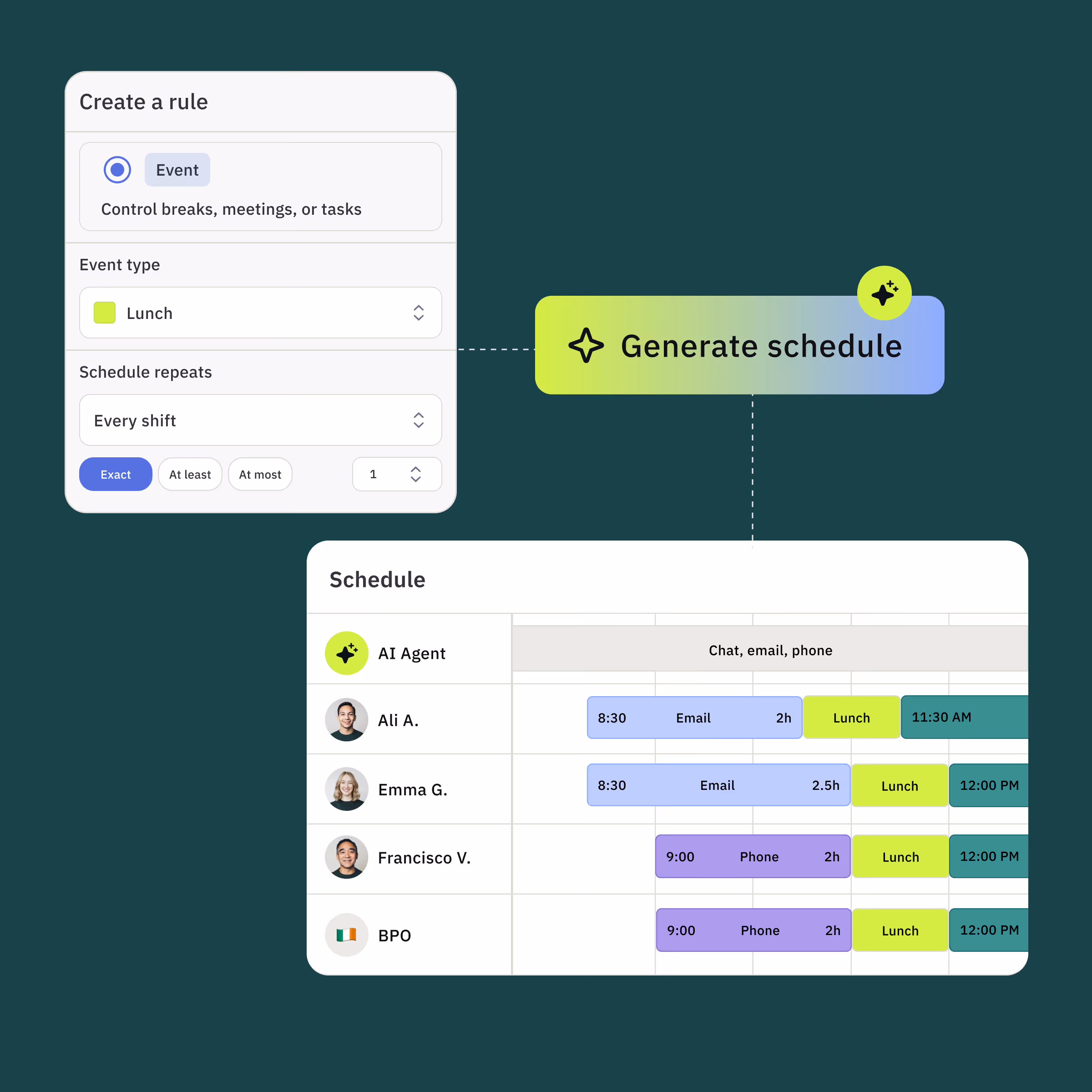 Automations insert lunches and breaks at optimal times based on coverage needs, not just whenever. Your agents get proper breaks, and SLAs stay protected.