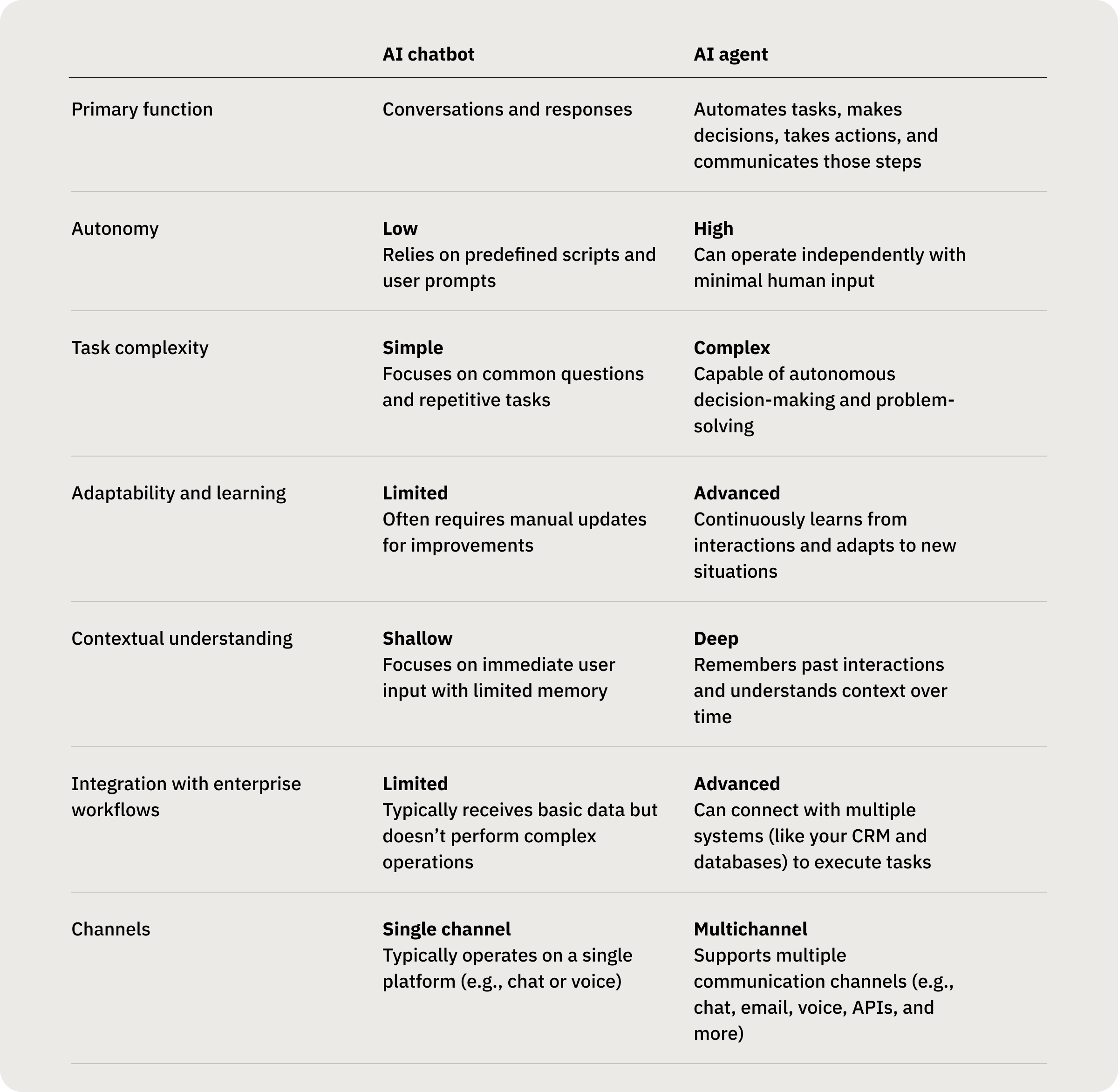 AI agents vs. AI chatbots: Comparison chart of key differences