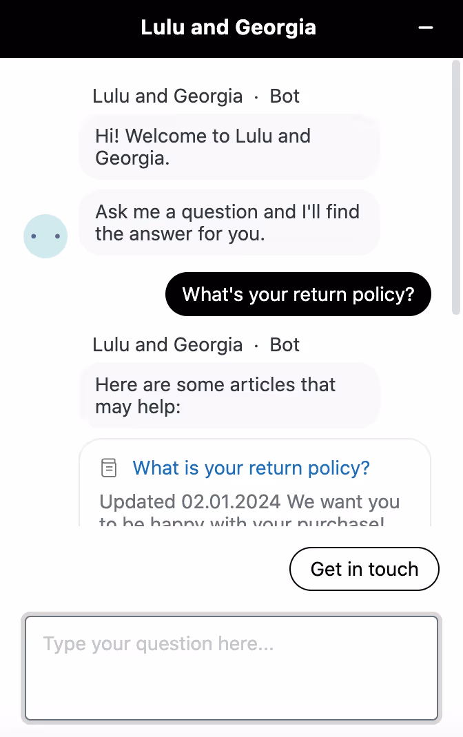 Home decor and furniture brand, Lulu and Georgia, uses Assembled Assist to automate routine customer interactions. Website visitors can click “Help” to open a chatbot directly on the website.