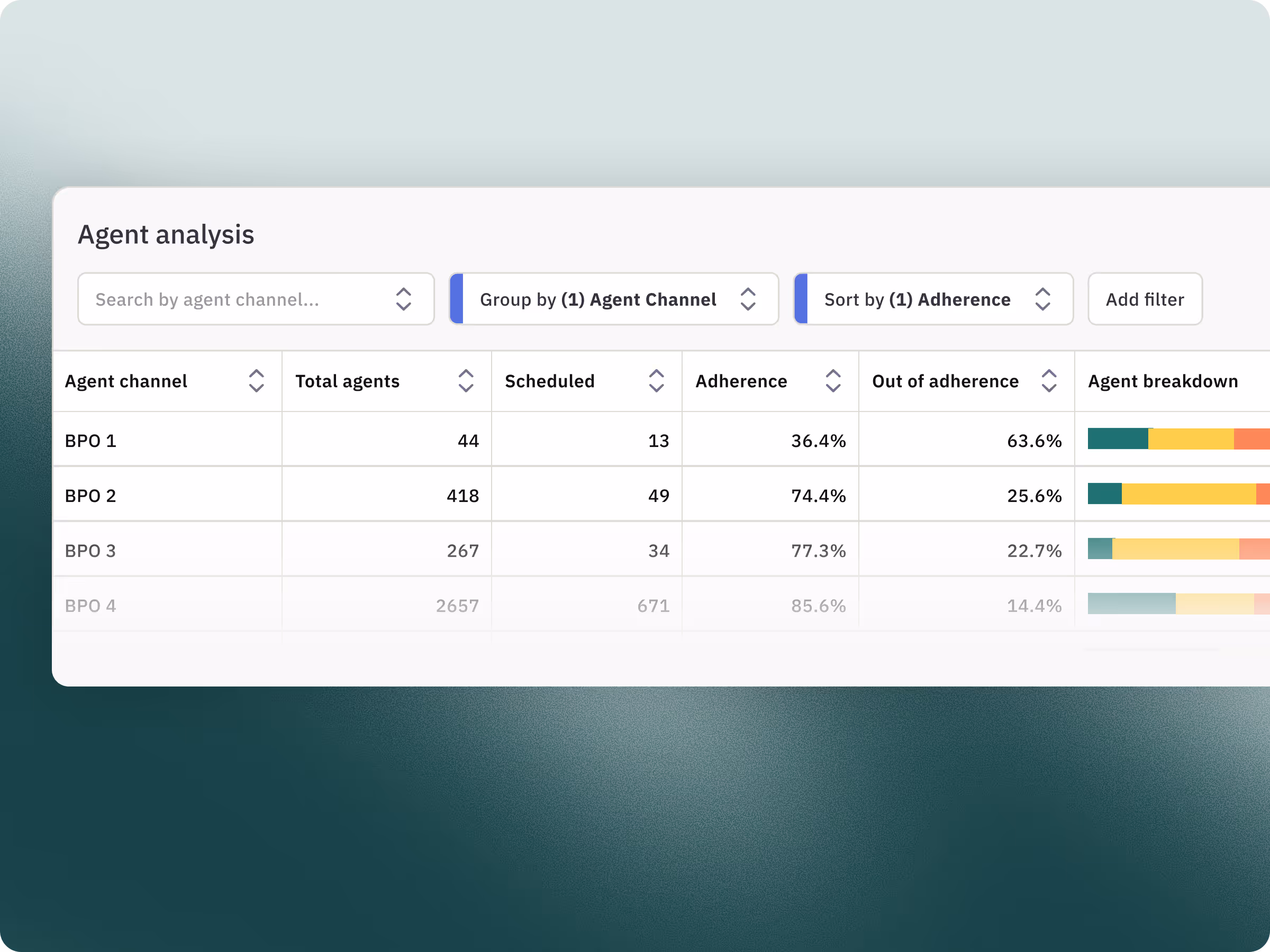 Real-time adherence monitoring across BPO sites and queues. View percentages in aggregate or drill down to specific agent-level metrics.